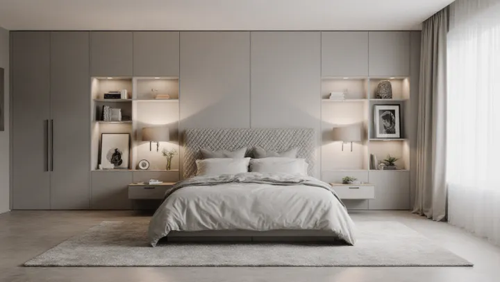 Многоуровневое освещение — ключ к функциональности: общее освещение для уборки, местные светильники у кровати для чтения и мягкие кромочные источники для атмосферы. Умные системы хранения, в том числе встроенные шкафы и выдвижные ящики, помогают избежать беспорядка и сделать комнату более практичной.