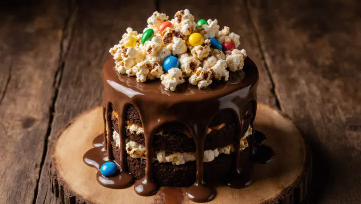 Новый рецепт предлагает необычное сочетание текстур и вкусов. В основе — насыщенные шоколадные слои, сверху — липкая карамель и слой свежего попкорна. Пирог задуман как быстрый и эффектный вариант для совместного вечера.