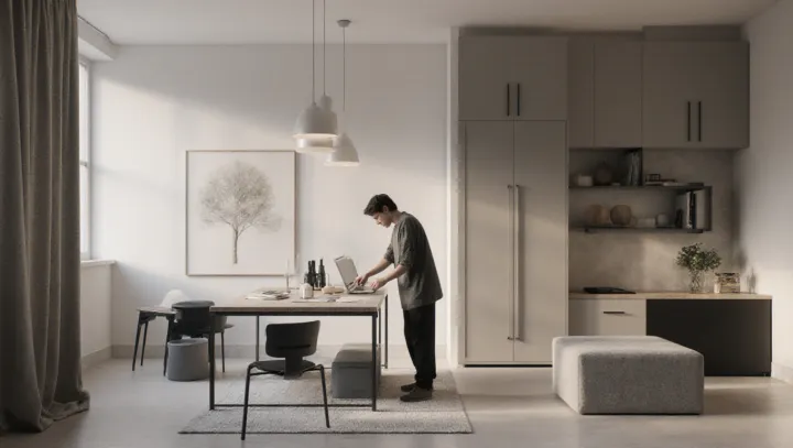 Многофункциональная мебель решает сразу несколько задач. Раскладной диван, стол-трансформер и стеллажи с рабочими поверхностями позволяют менять назначение зоны по необходимости. Это выгодно для повседневной жизни и приёма гостей.