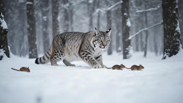 В глубине леса рысь использует обоняние и слух, чтобы заметить движение мелких грызунов под снежным покровом. Животное делает точные прыжки и раскопки, добывая скрывающуюся пищу даже при плотном слое снега.