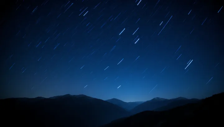 Над горами развернулась впечатляющая картина: яркие звёздные следы, запечатлённые при помощи длинной выдержки, образуют чёткие круговые узоры. Снимок привлекает внимание контрастом тёмного силуэта хребтов и нежного светового рисунка на небе. Такая композиция подчёркивает масштабы пейзажа и спокойную атмосферу ночи.