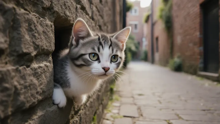 Небольшой котёнок привлёк внимание жителей, когда появился в отверстии одной из каменных стен в жилом районе. Животное выглядело настороженно и выглядывало, не решаясь выпрыгнуть наружу.
