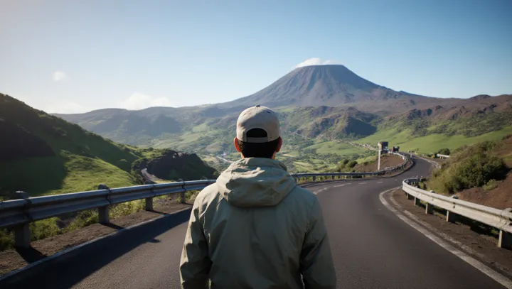 Ландшафт выглядит сурово и одновременно живописно. По дороге видны резкие повороты и участки с разной высотой. Свет меняет оттенки лавовых полей и кустарников, а на фоне неба дорога формирует графичные линии, интересные и фотографам, и любителям прогулок.