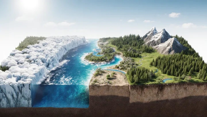 Атмосфера переносит тепло и влагу. Гидросфера — это океаны, моря и реки, которые аккумулируют тепло и регулируют температуру. Криосфера включает ледники и снежный покров, влияющие на отражение солнечного света. Биосфера — растения и животные, которые участвуют в круговороте углерода. Литосфера — земная кора, почвы и горы, которые формируют местный рельеф и сцепление воды.