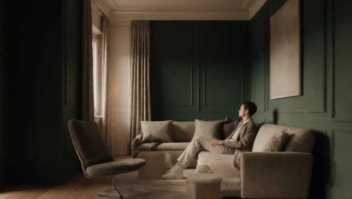 Осветлението е ключово — топла светлина омекотява тъмнозелените нюанси и ги прави по-приветливи. Ако не искате големи промени, започнете с аксесоари като възглавници, килими или вази и наблюдавайте как цветът променя атмосферата.