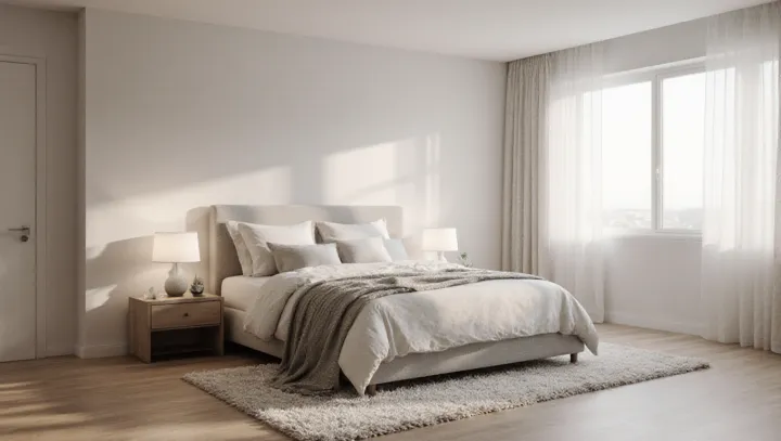 Глубину создают текстуры: мягкое постельное белье, плед, коврик и деревянные поверхности. Многослойность материалов добавляет тепла и уюта, не нарушая общей спокойной палитры. Особое внимание уделено практичности хранения и грамотному освещению.