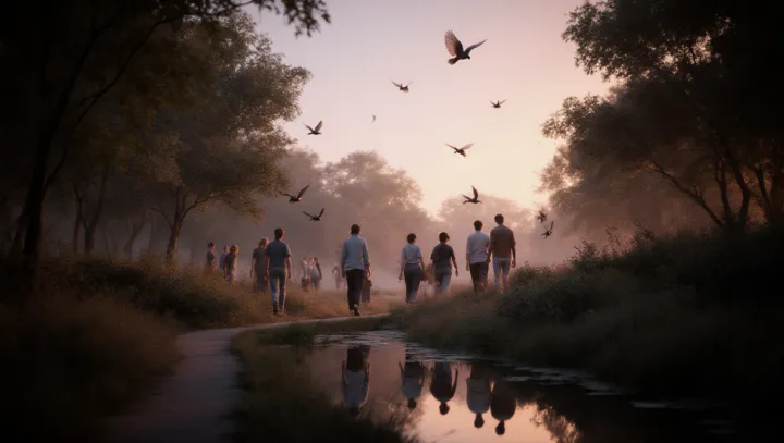 Птицы уменьшают активность или меняют манеру общения, насекомые начинают иные ритмы, и общая звуковая картина смещается: слышны приглушённые трели и едва заметный жужжащий фон. Эти изменения подчёркивают переходную природу сумерек и создают ощущение обновления окружающей среды.