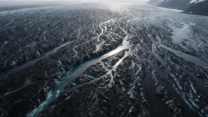 С воздуха чёрный ледник в Исландии выглядит как огромное художественное полотно. Тёмный лёд и полосы вулканического пепла чередуются с сетью талых каналов, образуя контрастные и ритмичные рисунки.