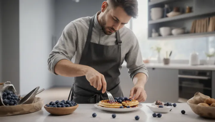Советы по выпечке и подаче: хорошо разогрейте вафельницу и при необходимости смажьте поверхность маслом. Выпекайте до устойчивой корочки, затем сразу подавайте, чтобы сохранить хруст. Замороженную чернику можно слегка обвалять в муке, чтобы она не опускалась на дно. Подавайте с йогуртом, сиропом или лёгкой посыпкой из сахара.