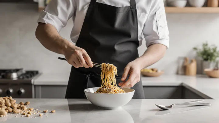 Готовка занимает несколько шагов: сварите лапшу и быстро охладите, смешайте в миске арахис и кунжут с соевым соусом, уксусом, подсластителем и тёплой водой до однородности, добавьте измельчённый чеснок. Перемешайте лапшу с заправкой, при необходимости подогрейте.