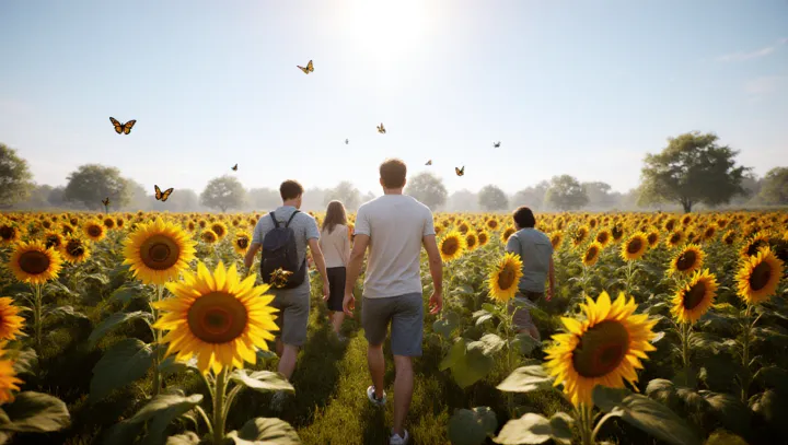 Поля выглядят впечатляюще: высокие стебли, повёрнутые к свету соцветия и лёгкий ветер, колышущий ряды цветов. Вокруг слышно жужжание насекомых и привычную тишину сельской местности, что добавляет ощущение уединения и спокойствия.