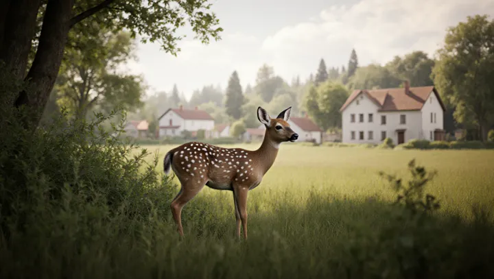 Коричневый оленёнок был замечен стоящим в кустах на краю луга перед деревней. Животное оставалось неподвижным и привлекло внимание проходивших и местных жителей, которые заметили его с безопасного расстояния.