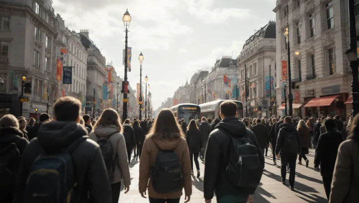 Лондон — плотный и энергичный город. Большое число жителей и гостей делает улицы и транспортные узлы загруженными. Это отражается на движении пеших потоков, работе общественного транспорта и доступности городских услуг.