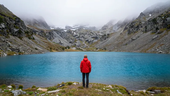 На височина под склоновете на Алпите се намира алпийско езеро, известно с прозрачните си и блестящи сини води. Местността се отличава с внушителни планински панорами, стръмни склонове и гъсти гори, които рамкират водната повърхност и усилват визуалния контраст.