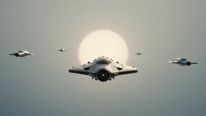 Несколько летающих космических аппаратов совершили перелёт к ярко светящейся планете. Яркое небесное тело привлекло внимание наблюдателей. Сообщается о групповой манёвренности и точном выходе на видимую орбиту вокруг планеты.