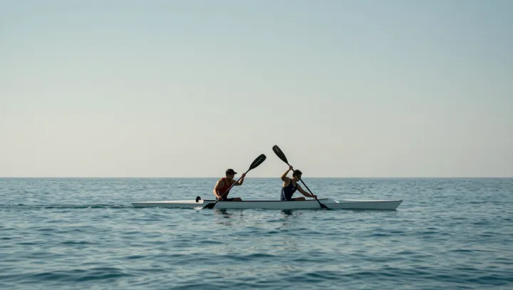 Пара работает синхронно: каждый гребок точен, корпус устойчив. Такое согласование движений требует баланса и долгой практики, особенно на узкой лодке, где даже небольшая ошибка может нарушить равновесие.