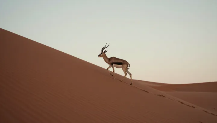 На крутом склоне красной дюны заметна одна фигура — антилопа, поднимающаяся вверх шаг за шагом. Она двигается неспешно, голова опущена, тело напрягается при каждом подёме, будто рассчитывает силу и равновесие. Вокруг пусто: больше ни одного движения, только чистая поверхность, нарушаемая её появлением.