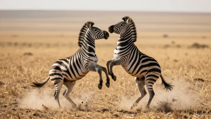 На саванне были замечены две зебры, вступившие в физическую стычку. Наблюдатели описывали резкие удары копытами и попытки укусить соперника. Стычка длилась несколько минут, после чего животные разошлись по своим делам.