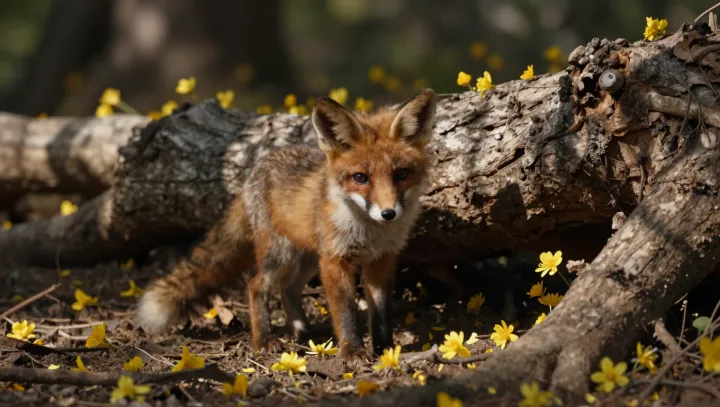 На скромна поляна едно малко кафяво лисиче е сгушено до голям оголен корен. Около него се простира кръг от златни цветя, които подчертават топлата му окраска и правят сцената визуално ясна и нежна.