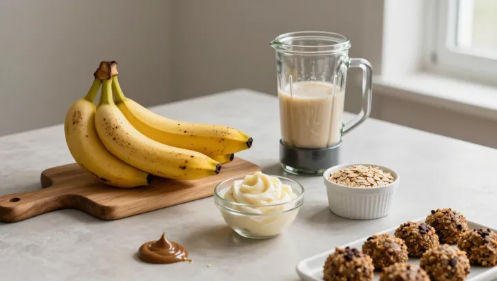 Самые простые варианты — смузи и "nice" мороженое, когда размятые бананы смешивают с ягодами или йогуртом и замораживают до кремовой текстуры. Для выпечки подходят кексы, хлеб и маффины: банановое пюре делает тесто влажным и ароматным без лишнего сахара. Энергетические шарики из банана, овсянки и орехов — удобный перекус для активных людей.