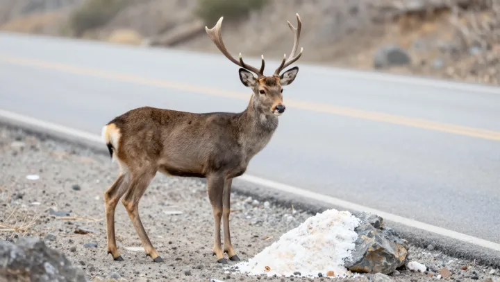 Край пътя едничък елен подушва чакъл и лиже бледа ивица сол — образ, който противоречи на свещената му репутация в различни култури. Този целенасочен акт разкрива биологията на оцеляването: животното не търси наслаждение от вкуса, а коригира йонен дефицит, жизнен за нервите, мускулите и течностния баланс.