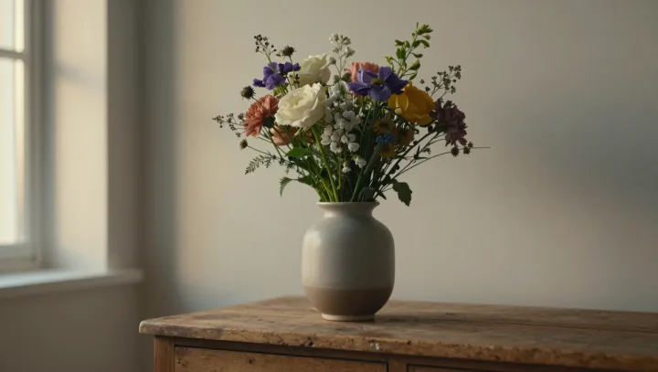 Дизайнер на деле управляет предельной полезностью контраста: один букет, умноженный на две структурированные вазы, помещён на единый грубоватый фон. Мозг легко разбивает сцену на аккуратные слои — объект, опора, задний план, — и при этом продолжает получать удовольствие от трения между старым и новым, гладким и шершавым, точным и рукотворным. Композиция воспринимается утончённой не потому, что объекты дороги сами по себе, а потому, что она попадает в оптимальную зону между сенсорной новизной и умственной экономией: глазу и комфортно отдыхать, и интересно рассматривать детали.