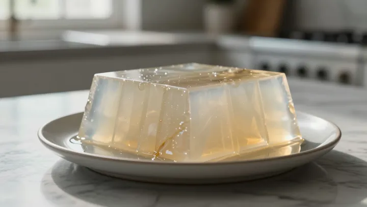 Торт, который на тарелке выглядит почти невидимым, всё равно сохраняет чёткий, острый срез, когда через него проходит нож. Секрет тут не в магии, а в желатине: он превращает смесь воды с сахаром в мягкое твёрдое тело за счёт желеобразования и формирования трёхмерной сети в микроскопическом масштабе.