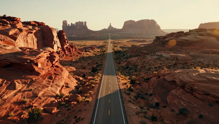 Шоссе, ведущее в Моньюмент-Вэлли, режет пустыню линией, будто начерченной по линейке. Асфальт, линия горизонта и башни из песчаника выстраиваются настолько чётко, что этот вид стал чуть ли не образцовой картинкой зрительной определённости: дорога, конечная точка — и ничто между ними, что, кажется, могло бы сгибаться или изгибаться.