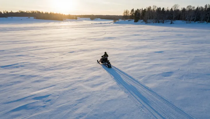 На высокой скорости снегоход на мягком, пушистом снегу ощущается спокойнее, чем на голом асфальте, потому что машина не столько цепляется за поверхность, сколько плывёт по ней. Широкая гусеница и передние лыжи распределяют массу по большой площади контакта, снижая давление на каждый квадратный сантиметр снега. При таком низком давлении снег не проваливается глубоко и не превращается в борозды, а уплотняется в тонкий, но несущий слой, не давая корпусу просесть и клюнуть носом.