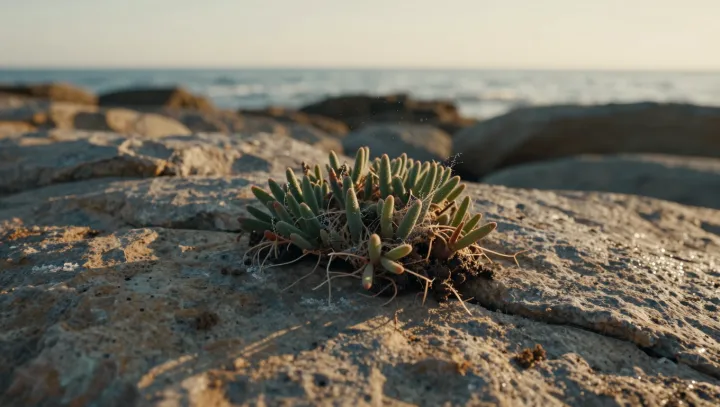Далее вопрос выживания сводится к водному балансу и нагрузке солью. Многие из этих первопроходцев опираются на осмотическую регуляцию и поддерживают низкий базовый уровень обмена веществ, чтобы в засушливые или штормовые периоды почти полностью останавливать активность. Суккулентные ткани или плотно сомкнутые розетки листьев накапливают небольшие запасы воды и снижают испарение. Солеустойчивые виды изолируют избыток ионов в вакуолях или выводят их через солевые железки, защищая жизненно важные ферменты. Некоторые переносят многократное высыхание, позволяя клеткам терять воду, а затем вновь ее набирать; гибкие клеточные стенки и защитные белки ограничивают повреждение мембран по мере того, как волны и соляной аэрозоль снова и снова проходят по поверхности скалы.
