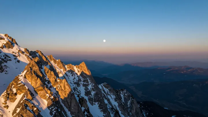 Горный закат часто завершается зрительным противоречием: долина уже погрузилась в темноту, а далёкие заснеженные вершины всё ещё светятся, и при этом бледная Луна поднимается в небе, уже освещённая тем самым Солнцем, которое только что скрылось из виду. Кажется, будто в картинке произошёл сбой, но это лишь геометрия, работающая в пространстве.