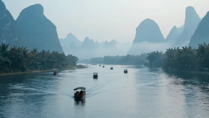 Зато глаза цепляются за самый яркий контраст: зелёные, затянутые дымкой склоны по обоим берегам. Эти горы занимают большую часть поля зрения и сохраняют форму, поэтому зрительная кора автоматически делает их «опорной» частью картины. На поверхности реки почти нет чётких ориентиров, и именно меняющийся рисунок берегов становится основным сигналом того, что что-то вообще движется.