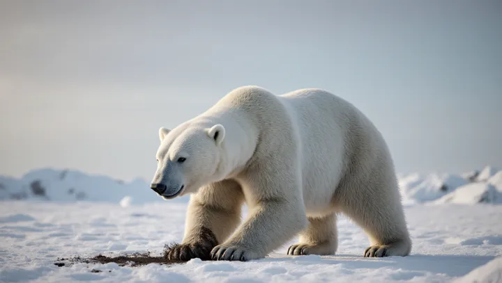Впечатляющая сцена разворачивалась на глазах у наблюдателей: белый медведь, получивший прозвище «Арктический Властелин», медленно пополз вперёд и стал тереть шерсть, пытаясь очистить пятна. Движения были размеренными. Короткие рывки сменялись спокойными паузами.