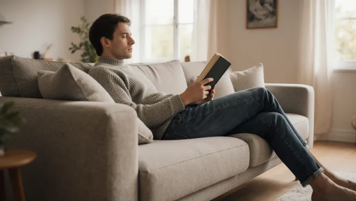 В тихой гостиной тканевый диван выглядит как центр обитания: на нём свалилась плед, там читают книгу, здесь садится ребёнок. Сцена простая, но наглядная — диван приглашает остаться.