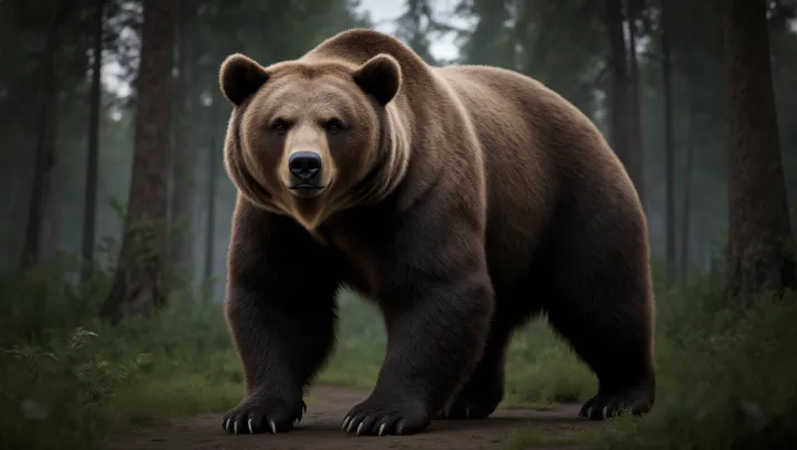 Внешне животное выглядит мощным: плотная мускулатура, тёмно-коричневый мех и внушительная масса тела. Бурые медведи обычно обитают в лесных и горных районах, где находят пищу и укрытия. Описанные признаки совпадают с характеристиками одного из крупнейших наземных млекопитающих.