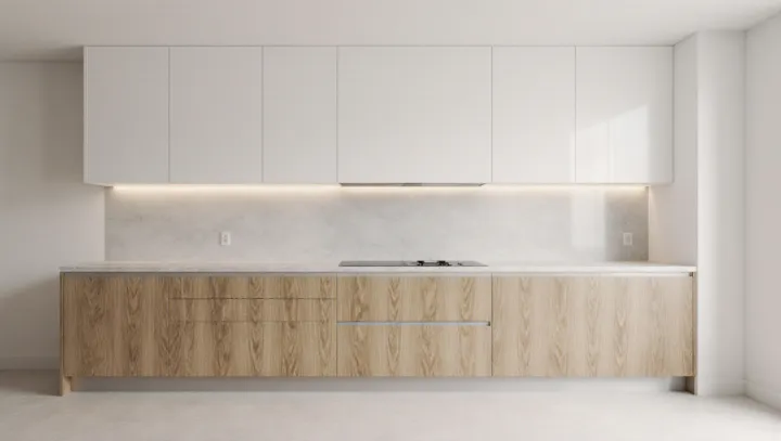Популярные решения: белый в паре с натуральным деревом создаёт светлую и тёплую атмосферу; тёмно‑синий в комбинации с латунной фурнитурой смотрится благородно и современно; двухцветные схемы — например, светлые верхние и тёмные нижние фасады — помогают подчеркнуть глубину и зонирование.