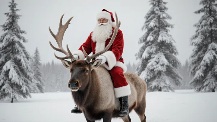 Многие праздничные иллюстрации и городские украшения показывают Санта‑Клауса в паре с лосем, а не с лошадью. Это заметно в витринах магазинов, на плакатах и уличных инсталляциях, где образ должен быть сразу понятен и узнаваем.