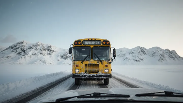 Из кабины водителя открывается впечатляющая картина: жёлтый автобус на первом плане и заснеженные горы Исландии на заднем. Яркий цвет транспортного средства резко выделяется на фоне белого снега и подчёркивает глубину пейзажа.