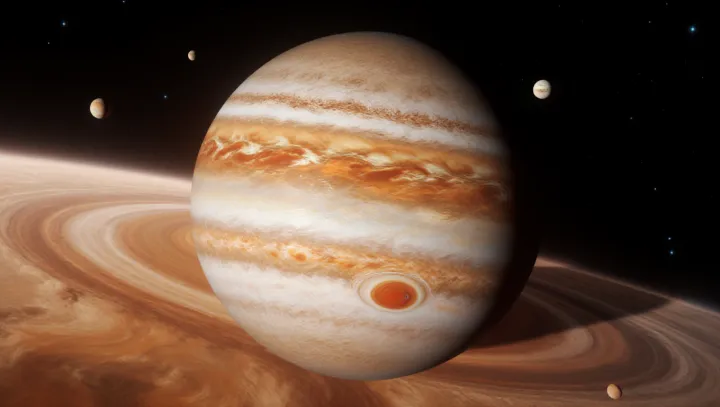 Юпитер — самая крупная планета в Солнечной системе. Для местных читателей это ближайший пример газового гиганта: массивный, обречённый на сильные атмосферные явления и заметный своими масштабами.