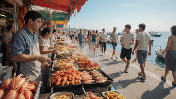 В прибрежных городах повсюду можно встретить киоски и лотки с уличной едой, где морепродукты занимают центральное место. Такие точки расположены на рынках, вдоль набережных и прогулочных зон. Еда продаётся по доступной цене и быстро готовится на месте.