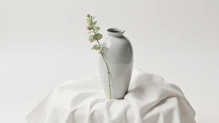 В центре композиции — сжатая фарфоровая ваза, аккуратно размещённая на белой ткани, совпадающей по тону с изделием. Простая палитра и чистые линии делают предмет главным визуальным акцентом.
