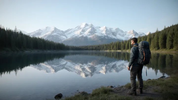 В центре внимания — спокойная поверхность озера, которая точно отражает заснеженные вершины, образуя полноценное зеркальное изображение. Эта простая, но выразительная сцена привлекает внимание как фотографов, так и любителей природы.