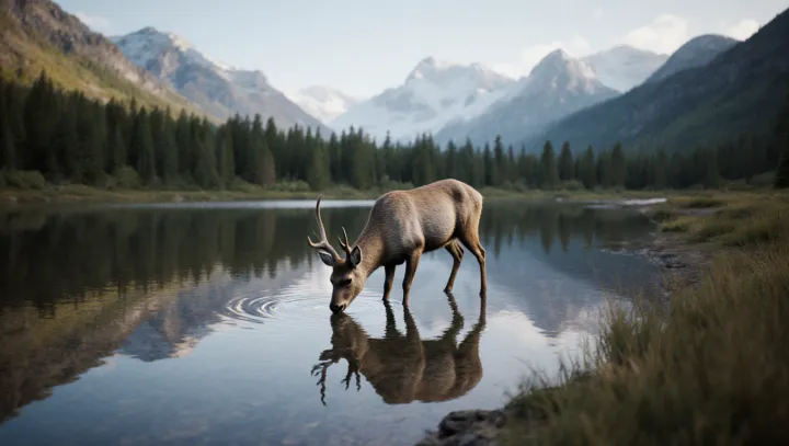 У кромки мелкого озера заметили оленя. Он стоял неподвижно и пил прозрачную талую воду, стекавшую с близлежащих гор. Сцена была спокойной и краткой, но выразительной.