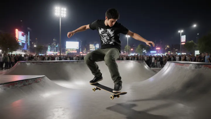 Скейтбордист поднялся в воздух и уверенно провёл доску через чистый аэр-манёвр. Выполнение отличалось плавностью и аккуратностью, что сразу бросилось в глаза присутствующим.