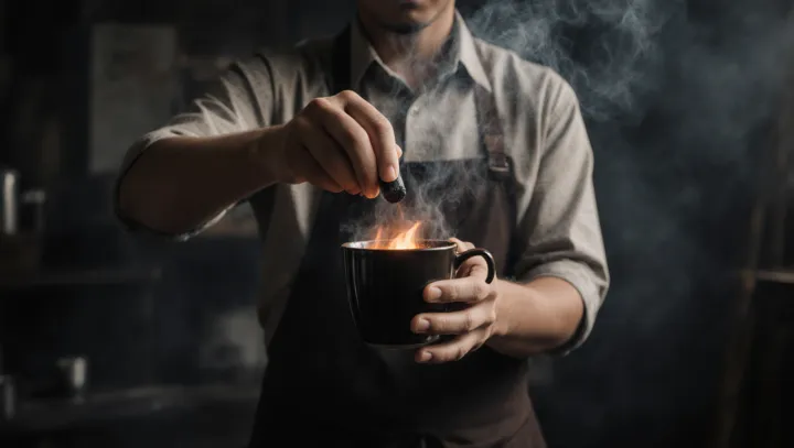 Процесс выглядит спектаклем. Небольшой кусок угля разогревают до светящегося состояния и опускают в тёмный кофе. От контакта с жидкостью поднимается дымный аромат, а вкус становится более глубоким и непривычным для тех, кто привык к фильтр-кофе или латте.