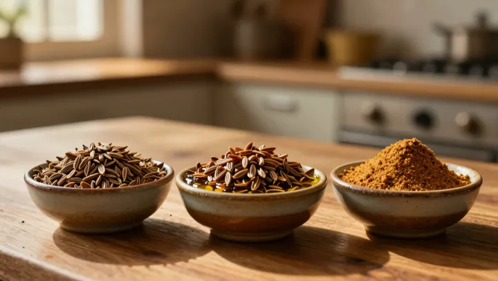 Сначала целые семена тмина попадают в горячее масло на стадии «тадки» — ароматической заправки, когда летучие масла быстро испаряются при высокой температуре. Этот короткий тепловой удар высвобождает верхние ноты аромата, богатые терпенами и альдегидами, даря блюду тот самый мгновенно узнаваемый «карри-запах». На этом этапе семя остаётся в основном целым, поэтому его более глубокие соединения по-прежнему заперты внутри, сохраняя запас вкуса для следующих стадий готовки.