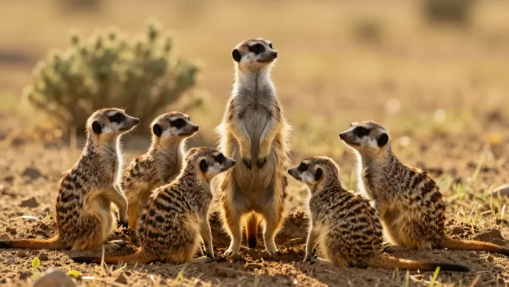 Кольцо вертикальных силуэтов вычерчивает контур на песке: каждый сурикат застывает на задних лапах, чёрные глаза выискивают хищных птиц, пока остальные члены группы растворяются в разветвлённой системе нор ниже. Картина кажется почти постановочной, но для исследователей это отлаженный социальный механизм, созданный, чтобы выдерживать беспощадные условия пустыни.