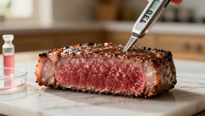 Окраска говядины определяется миоглобином, а не кровью. По мере повышения температуры миоглобин изменяет свою структуру и то, как он поглощает свет, — этот процесс называется денатурацией белка. Но на эти изменения также воздействуют кислотность среды, выдержка мяса и даже то, испытывало ли животное стресс. В результате два стейка с одинаковой внутренней температурой могут выглядеть совершенно по‑разному. Вы можете увидеть тёмно‑красную сердцевину и решить, что стейк недожарен, тогда как повар видит показания термометра в диапазоне medium rare и доверяет физике, а не картинке перед глазами.