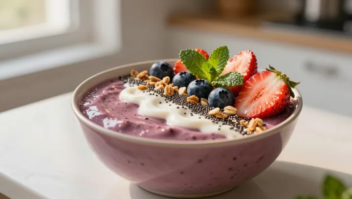 Глянцевый фиолетовый смузи-боул может восприниматься как десерт, но с точки зрения питания он гораздо ближе к сбалансированному приему пищи. Когда ягоды, бананы и листовая зелень взбиваются вместе с йогуртом или растительным белком и дополняются овсянкой, семенами чиа или орехами, в одной порции с контролируемой калорийностью оказывается сконцентрирована плотность пищевых волокон и антиоксидантов из множества цельных продуктов.