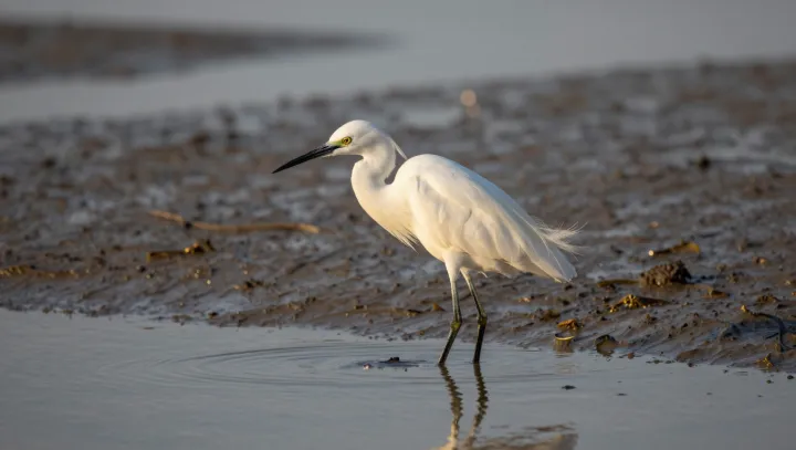 Мелководье у берега кажется спокойным, но под лапами маленькой белой цапли оно превращается в контролируемое поле возмущений. Пока птица вроде бы просто неторопливо зачерпывает рыбу себе на завтрак, её настоящая «машина эффективности» скрыта в лапах.